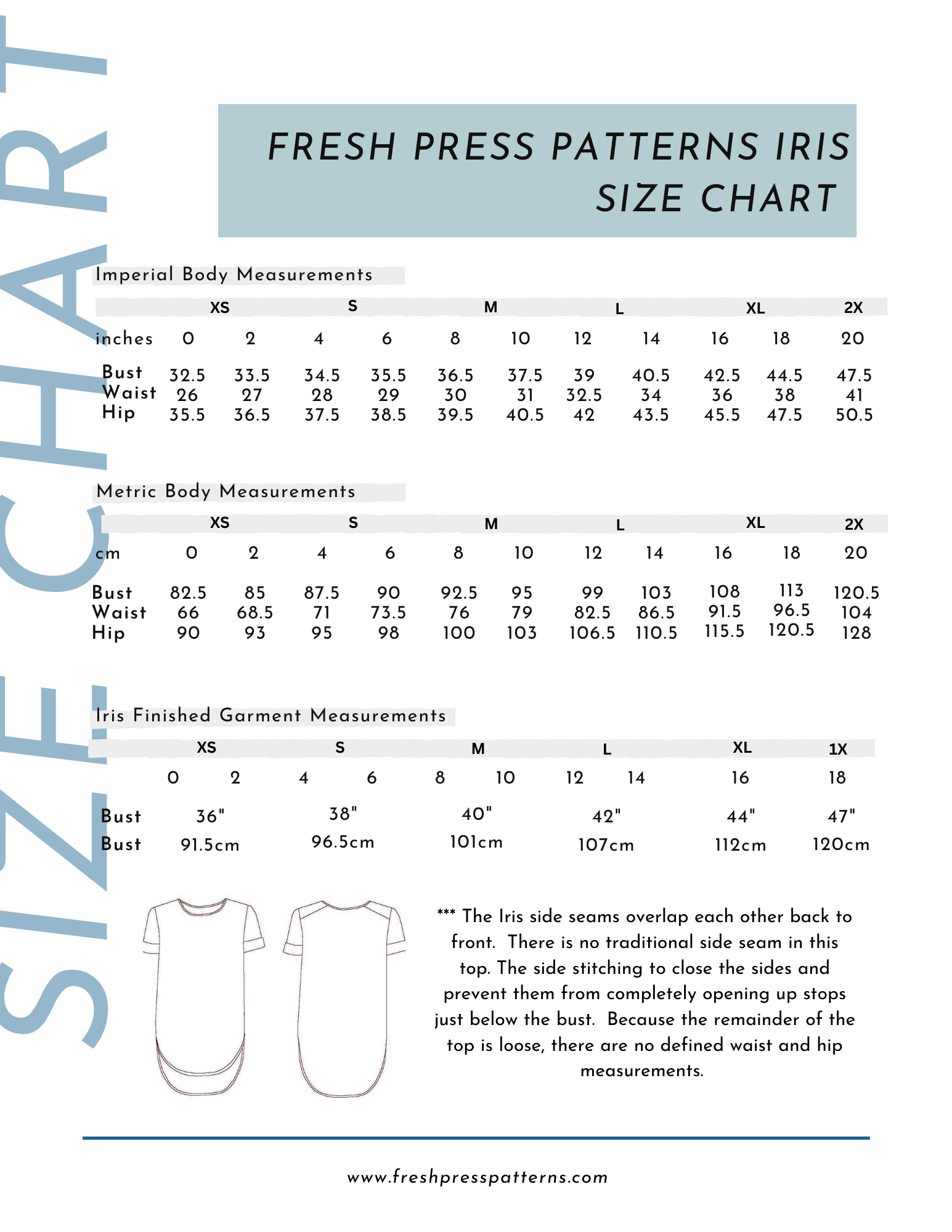 The Iris Top is designed to be a timeless and effortless wardrobe staple. Choose medium weight fabric with soft to medium drape: crepe, Tencel, linen, double gauze, chambray, heavier silks, shirting fabrics etc. You may also use fabrics with minimal stretch of no more than 5%.