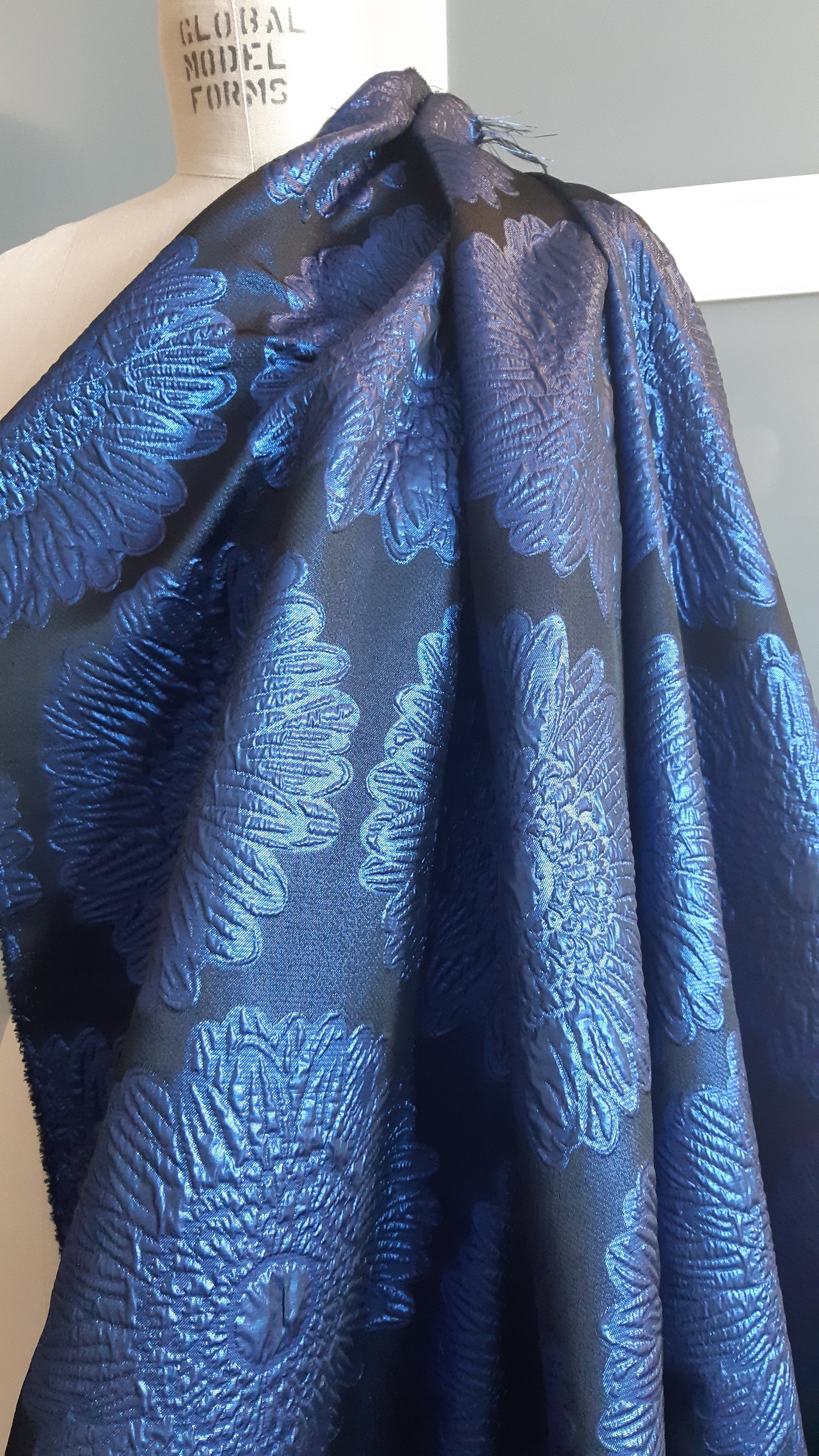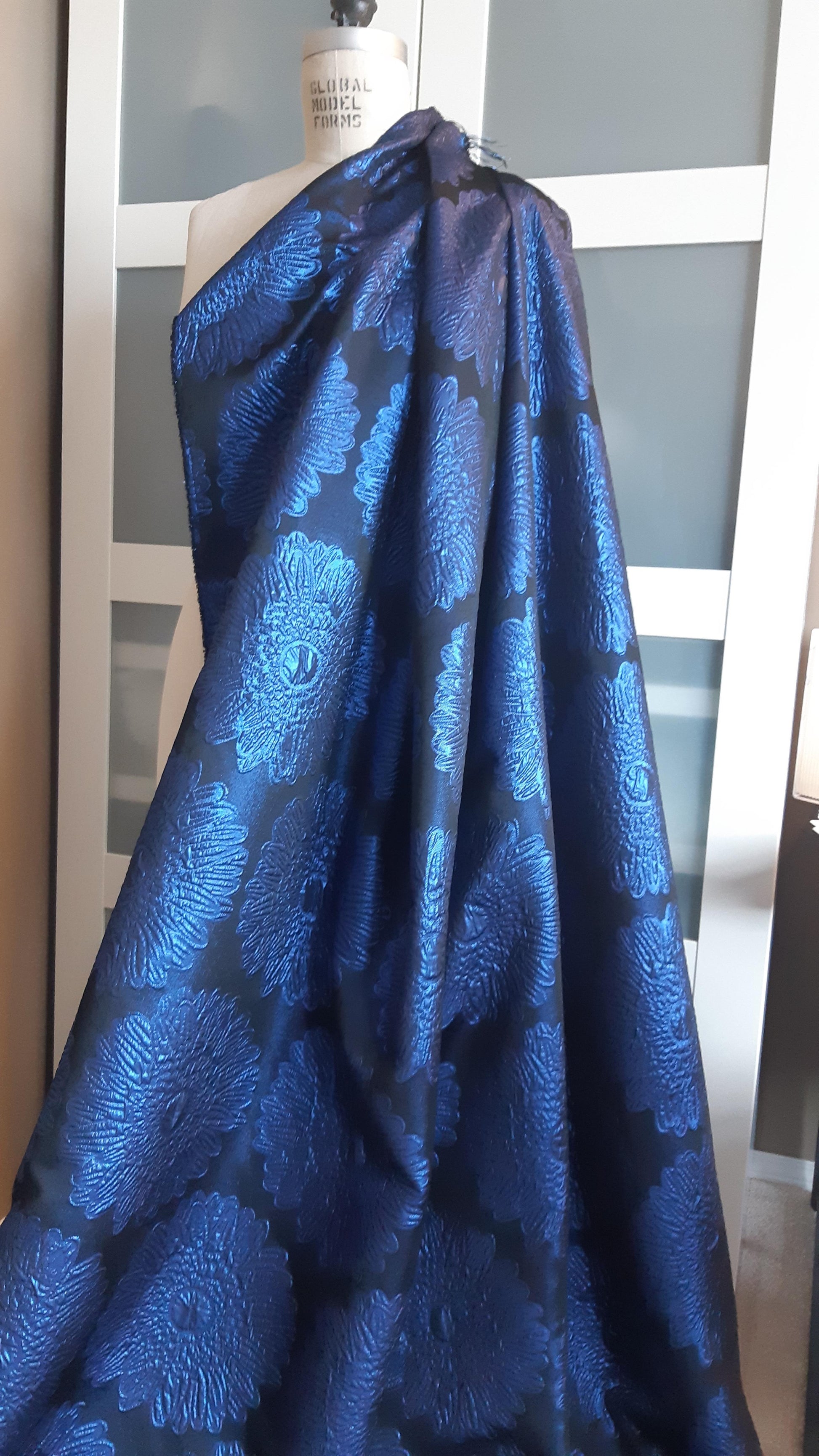 Stunning brocade from France. Metallic fiber gives the fabric a beautiful sheen. Medium weight is ideal for dresses, skirts, even light weight lined coats.