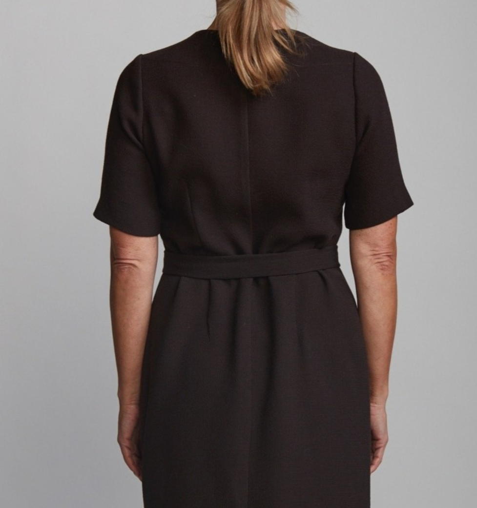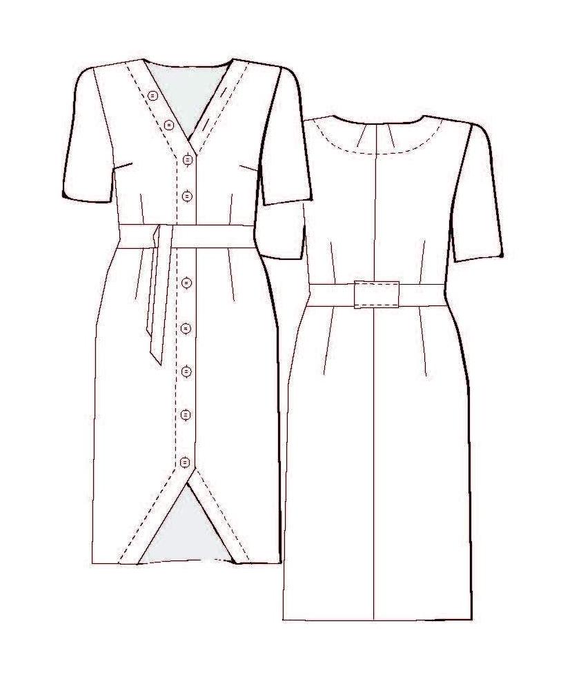 Meet the Evi dress. Trimmed with center front buttons. Tailored for a slim fit and belted for added definition. The front hem upside down "V" cut out allows for easy movement and an eye catching detail. Make it in denim for a casual everyday dress or a wool/wool crepe to add a little more sophistication. The Evi will also work well in a thicker cotton twill or linen. The dress is unlined. You'll reach for this dress year round.