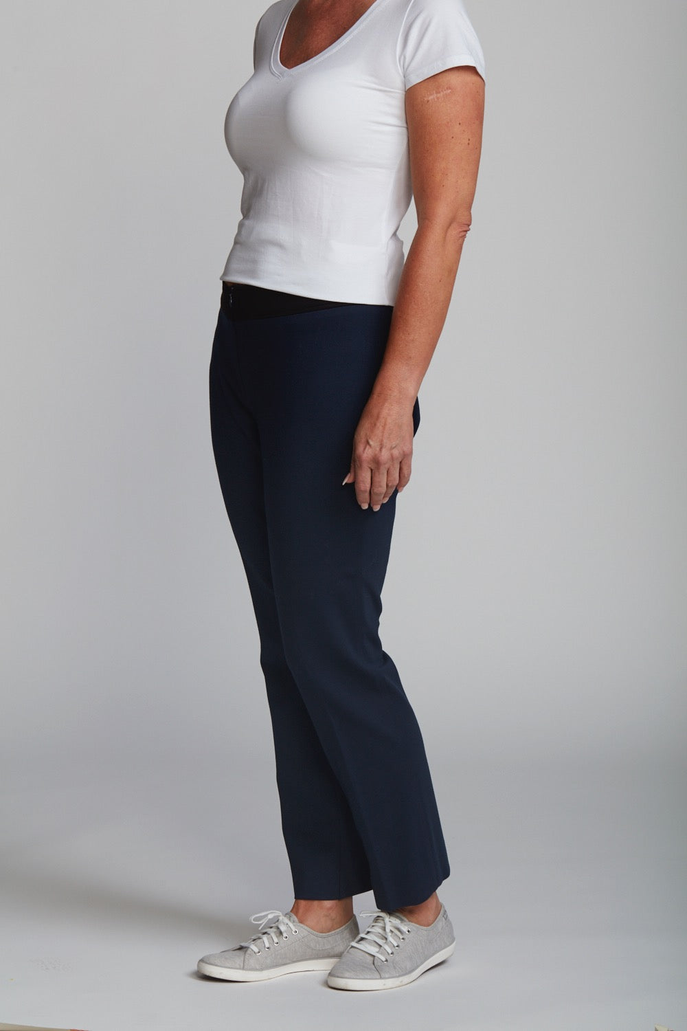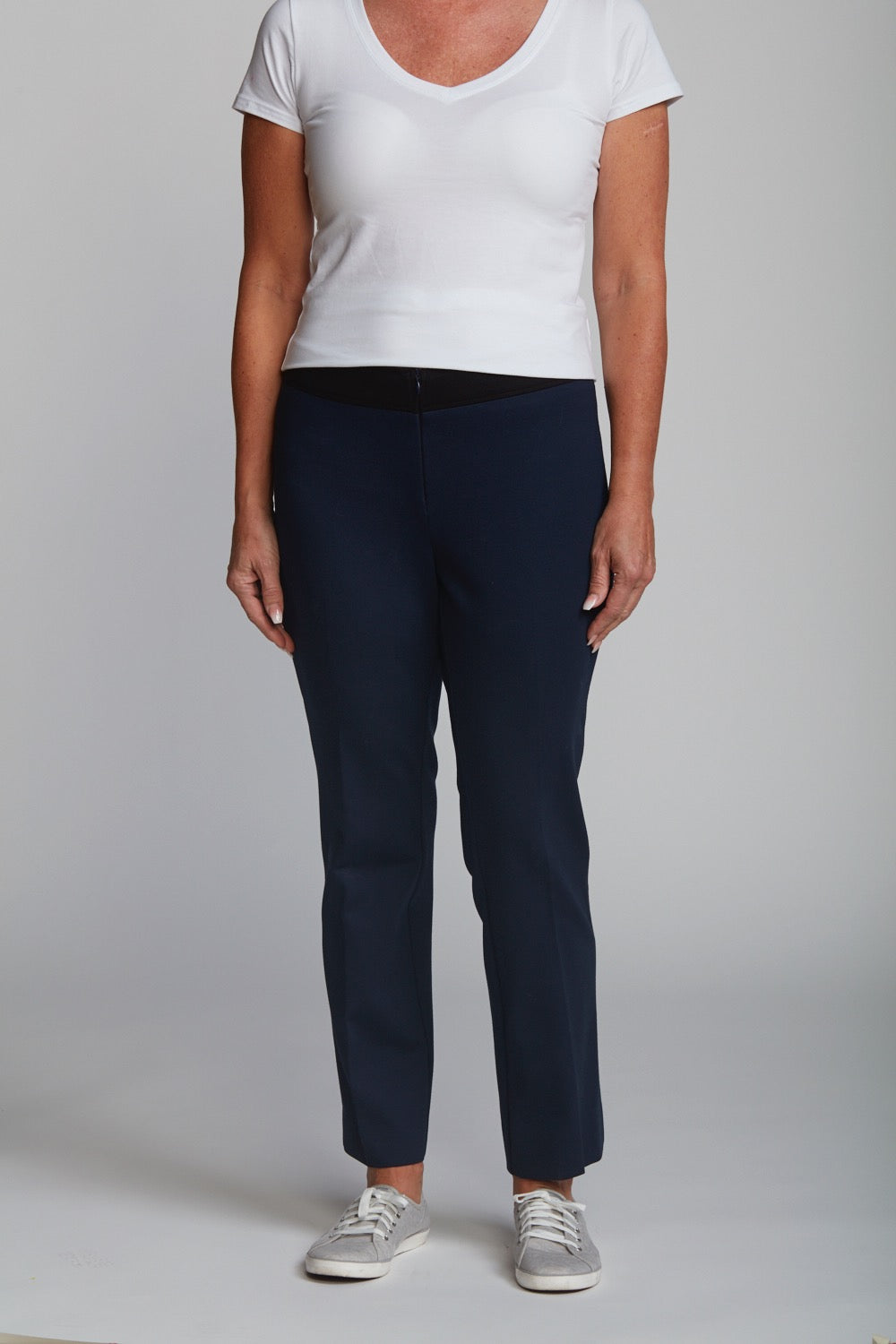 The James Knit Pant offers both style and comfort. It is designed for those days when you need to look presentable, but still want to feel like you're wearing your favorite cozy leggings. Made from ponte fabric, this pant provides structure, the comfort of stretch, all while maintaining a comfortable knit feel. It features a medium rise and a contour waistband for a flattering fit, and a neat, invisible center front zipper closure to reduce excess fabric. The pressed creases on the front create the illusion of a slimmer leg. Additionally, sewing instructions are included to modify the pattern into a modern bootcut style.