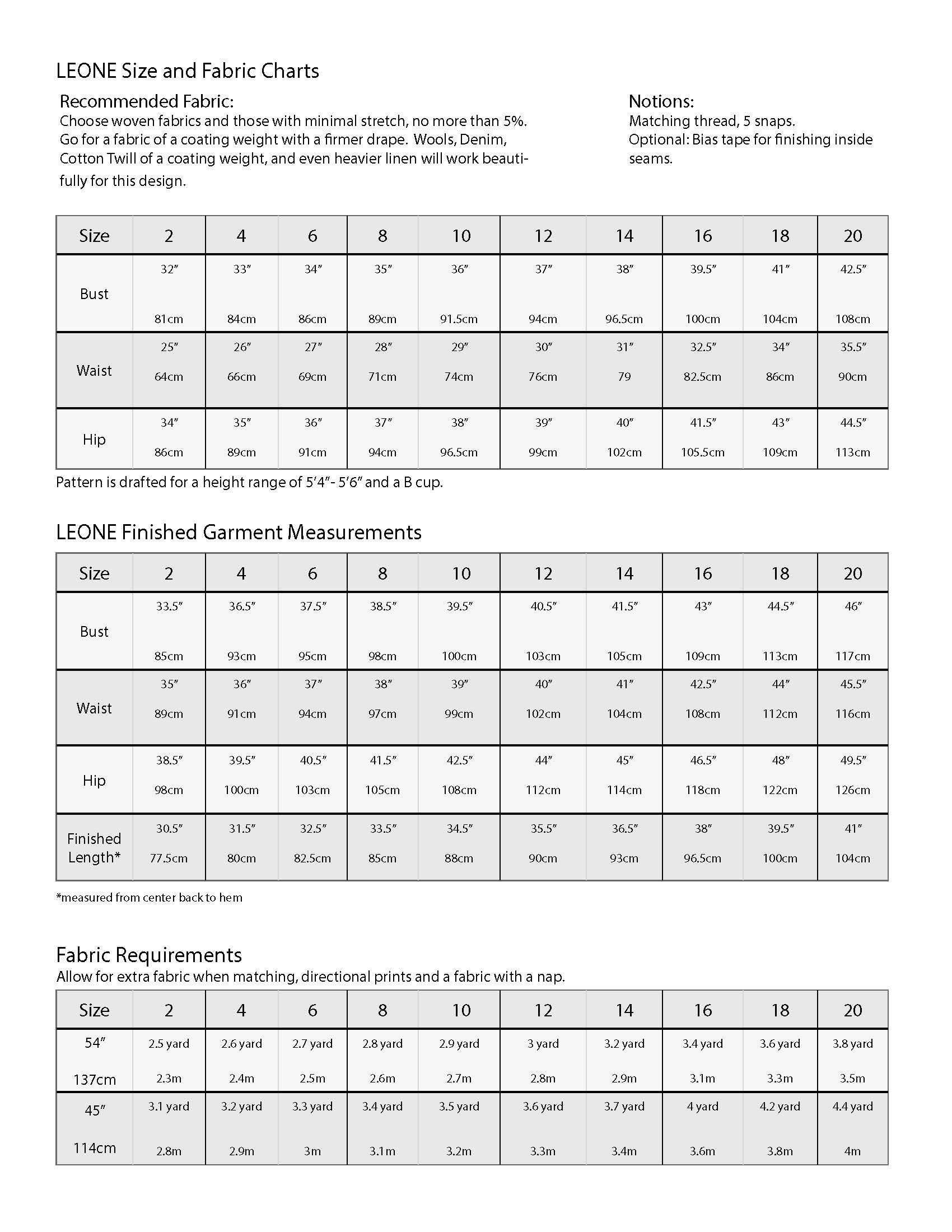MATERIALS:Fabric: 2.3-3.5yards (see chart)